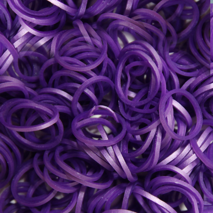 Συσκευασία με περισσότερα από 300 ειδικά λαστιχάκια σιλικόνης (latex free) σε μεταλλικό μωβ χρώμα, για χρήση με τον αργαλειό Rainbow Loom.
